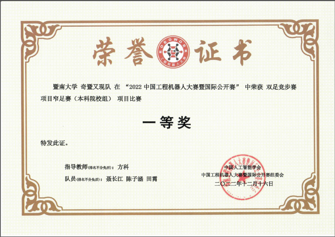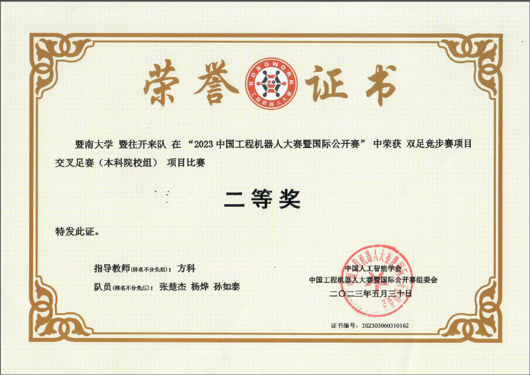 2023年中国工程机器人大赛暨国际公开赛于5月19-21日在安徽工程大学举办,国际能源学院机器人实践中心在校区和学院的支持下,由方科老师指导和组织的5支队伍参加了 “窄足赛”,“交叉足赛”,“视觉机器狗识别赛”3个项目的比赛。近日,组委会公布了比赛结果,参赛的5支队伍共获国家级二等奖1项,三等奖4项。