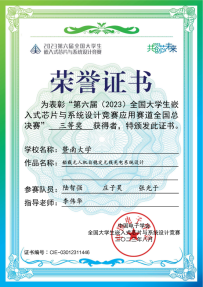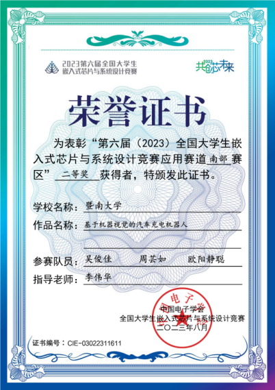 李伟华老师指导的本科生陆智强、庄子昊、张光于的参赛作品《船载无人机自稳定无线充电系统设计》获全国三等奖,本科生吴俊佳、周芸如、欧阳静聪的参赛作品《基于机器视觉的汽车充电机器人》获南部赛区二等奖。