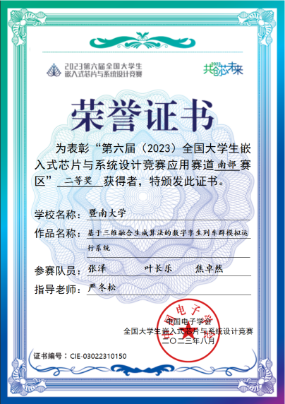 严冬松老师指导的本科生张泽、叶长乐、焦卓然的参赛作品《基于三维融合生成算法的数字孪生列车群模拟运行系统》获南部赛区二等奖,李雅菁、孙智昊、陈艺峰的参赛作品《智能中医理疗仪》获南部赛区二等奖。